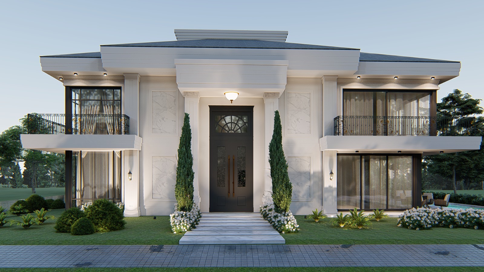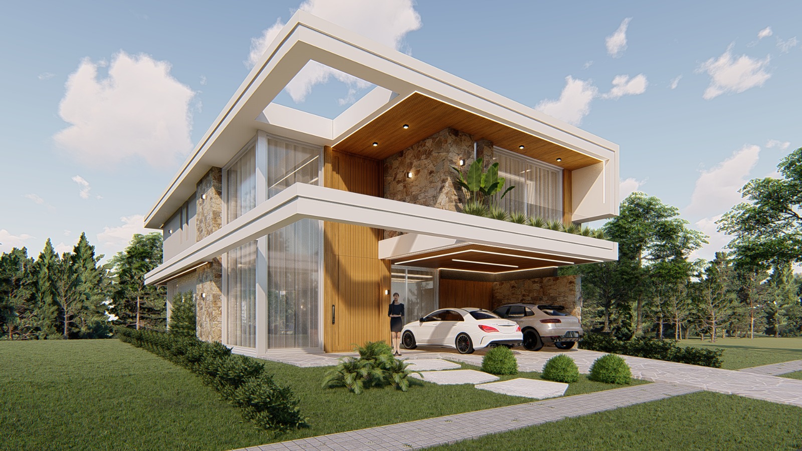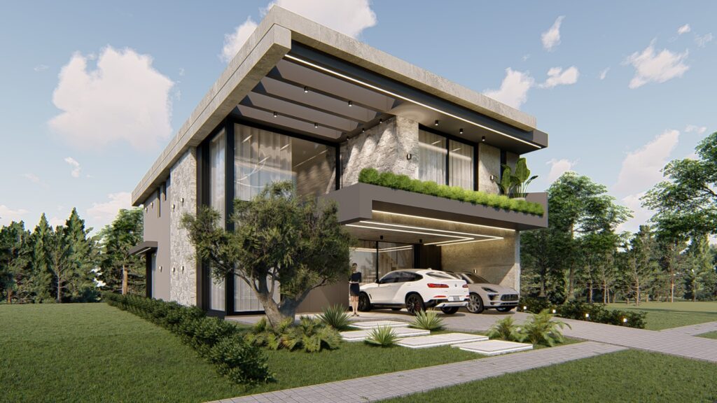 O projeto contemporâneo se destaca pela fachada imponente, com 90% revestida em pó de mármore italiano, refletindo elegância e durabilidade. A casa conta com espaço de estacionamento aberto para até 3 veículos e oferece total comodidade com elevador e automação residencial completa.