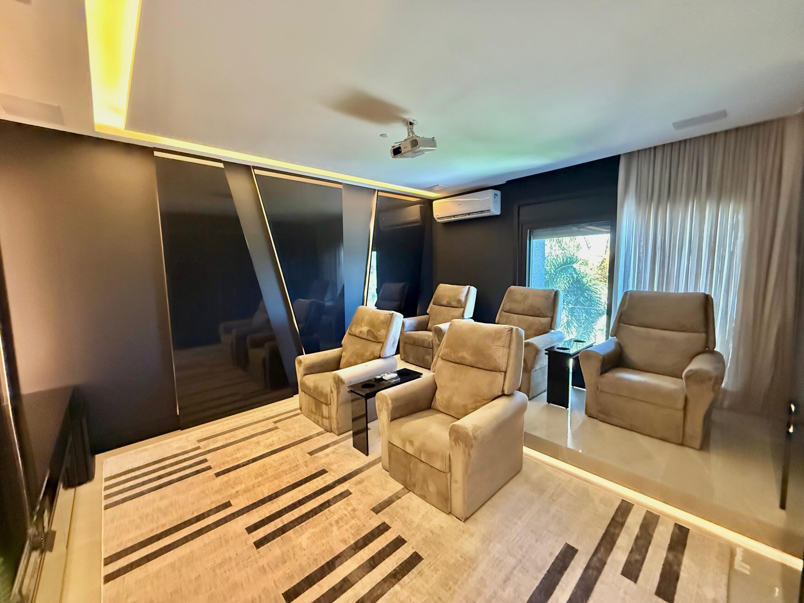 São 5 suítes amplas, sendo uma térrea, garantindo acessibilidade e conforto. O living integra 5 ambientes harmoniosos, criando espaços ideais para convivência e recepção. A área social é complementada por sala de cinema equipada com projetor, cozinha gourmet, cozinha de serviço e dependência completa.
